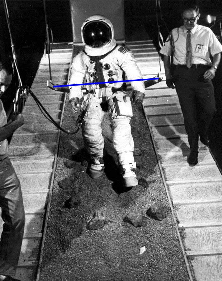 Интересны они, прежде всего, тем, что по точкам подвеса в симуляторах лунной гравитации можно увидеть место, где экспериментаторы НАСА определяли центр масс всей системы вместе с астронавтом и рюкзаком PLSS. (Точнее говоря, мы видим не сам центр масс, а его проекцию на скафандр спереди)