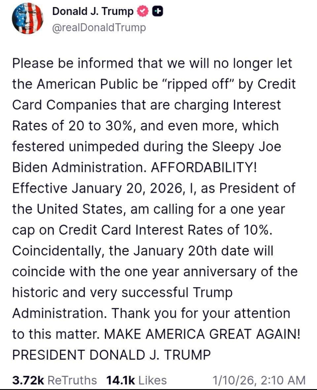 ДОСТУПНОСТЬ ПО ЦЕНЕ! Начиная с 20 января 2026 года, я, как президент Соединенных Штатов, призываю к однолетнему ограничению процентных ставок по кредитным картам на уровне 10%. Так совпало, что 20 января будет отмечаться первая годовщина правления исторической и очень успешной администрации Трампа. Спасибо вам за ваше внимание