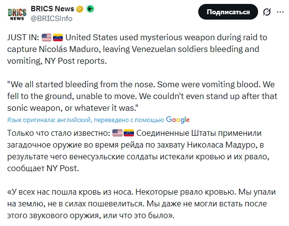 У Штатов "действительно есть вооружение, использующее направленное излучение микроволн, но прежде оно ни разу не применялось". В зоне поражения люди выводятся из строя на 15 минут, им кажется, что голова раскалывалась изнутри, повреждаются некоторые внутренние сосуды.