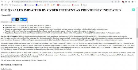Jaguar Land Rover опубликовала данные по оптовым и розничным продажам за третий квартал 2026 финансового года, который завершился 31 декабря 2025 года. Картина получилась тяжёелой: выпуск автомобилей смог вернуться к нормальному уровню только к середине ноября после киберинцидента, а затем компании потребовалось дополнительное время, чтобы распределить готовые машины по мировым рынкам. Эти факторы одновременно ударили и по отгрузкам дилерам, и по фактическим продажам конечным покупателям.