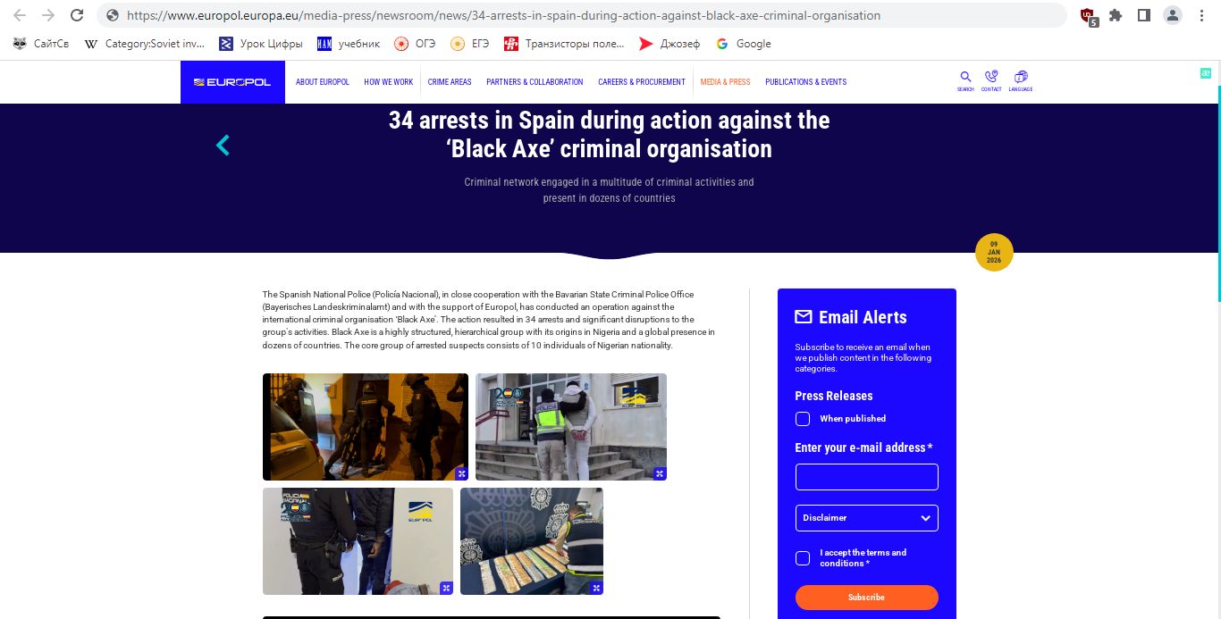 Международная операция, проведённая испанской полицией при поддержке Европола и криминальной полиции Баварии, завершилась арестом 34 предполагаемых участников преступной группы Black Axe. Задержания прошли в Севилье, Мадриде, Малаге и Барселоне. По данным властей, члены группировки причастны к масштабному финансовому мошенничеству и целому ряду других тяжких преступлений.