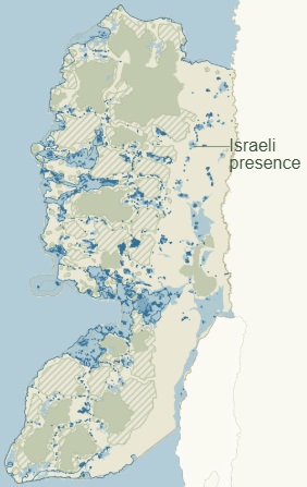 Обстановка на ЗБИ: еврейские оккупационные поселения раскрашены синим цветом; серые островки – условный контроль Палестинской автономии; помечено штрихом – под контролем Израиля; бежевая и голубая зона – фактически аннексировано израильским оккупационным режимом