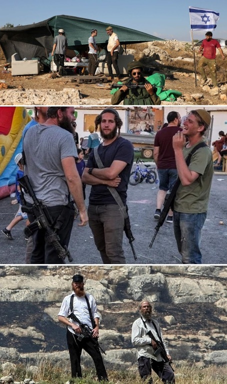 Женевская конвенция от 12 августа 1949 года о защите гражданского населения во время войны запрещает оккупирующей стороне перемещать своё гражданское население на оккупированную ею территорию, однако Израиль грубо нарушает эту Конвенцию, как и всё международное право. В настоящее время на территориях Палестины постоянно проживает примерно 1,1 млн еврейских гражданских оккупантов, ими занят город Иерусалим и земли Западного берега реки Иордан (ЗБИ), где созданы 170 нелегальных поселений и 260 аванпостов (как показано на карте выше), вторые существуют в противоречие даже израильскому закону, поскольку они основываются на частной или государственной земле. Численность и площадь населённых пунктов постоянно меняется: создаются новые аванпосты, другие из них легализуются; поселения расширяют и создаются новые по решению израильского правительства. Этот миллионный контингент находится под защитой многочисленных оккупационных войск, точное поголовье оных представляет собой секретные данные. Поселенцы обучают своих детей и женщин пользоваться огнестрельным оружием и даже автоматами.