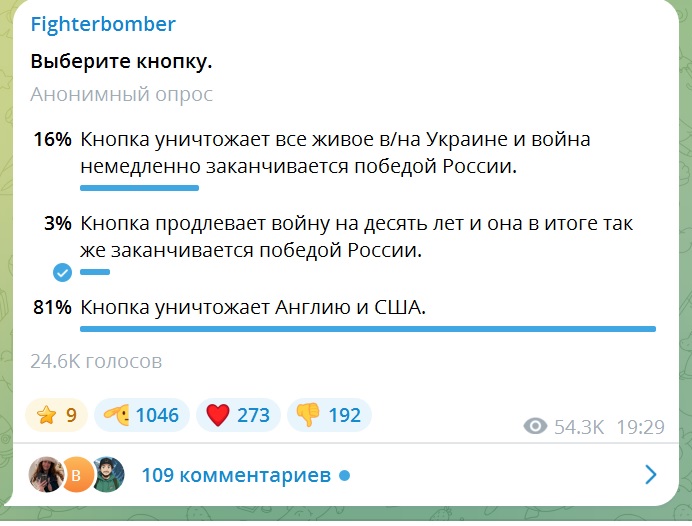 И вот вам результаты голосования мирных околодиванных граждан. Телега, автор - широко известный и неоднозначный участник и "наполнитель" канала "Соловьёв Live!" FB. Человек умный и, судя по всему, весьма ехидный.