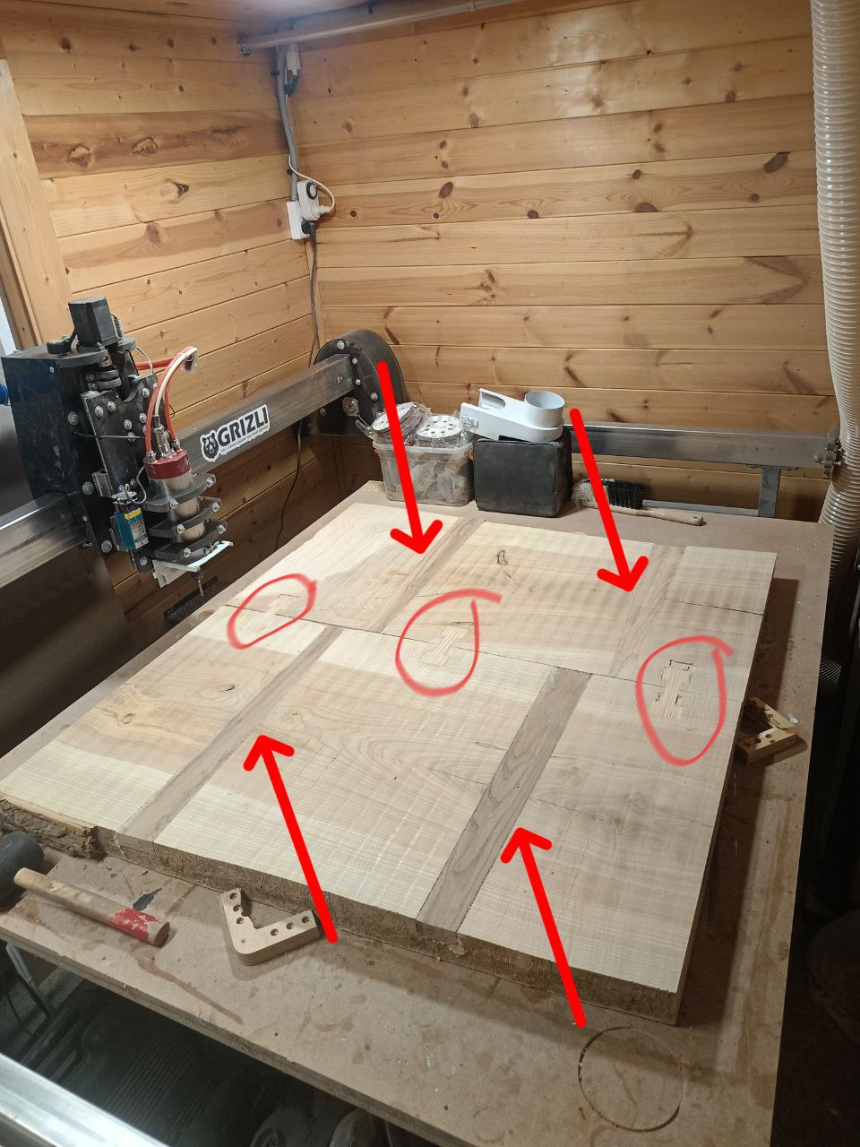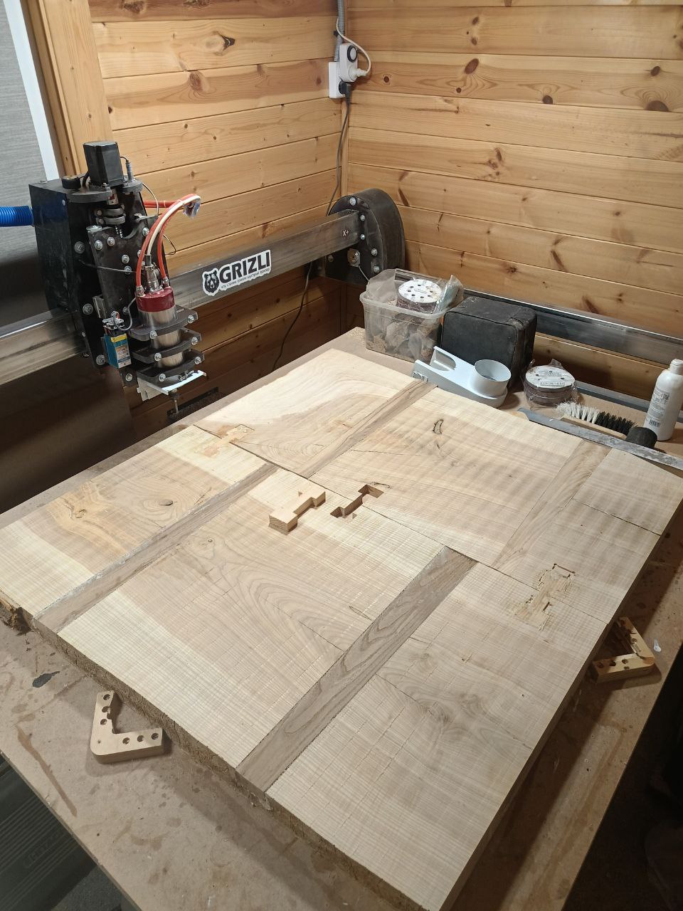 Он посоветовал сделать в каждый из слэбов клинья-вставки из твердого дерева (я выбрал карагач), которые не только забиваются в основной слэб, но еще и на столярный клей сажаются. Плюс1 между собой пришлось соединить их "бабочками". Я так и сделал. Плюс отфрезеровал оба слэба чтобы они были одного размера - по длине, ширине и высоте. Работка та еще, скажу я вам. На подготовку этого полотна ушло 3 дня работы с неумения и непривычки.