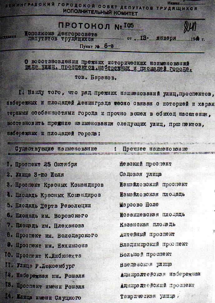 В начале 1944 года улицам, площадям и набережным в историческом центре Ленинграда возвратили дореволюционные названия. На карту города вернулись Невский проспект, Дворцовая площадь, Садовая улица и другие объекты, которые два десятилетия "скрывались" под именами революционеров и датами, связанными со становлением диктатуры пролетариата.