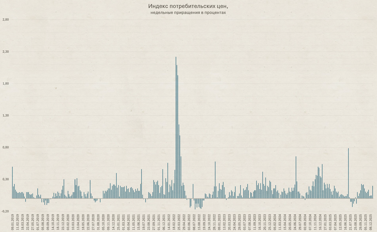Что еще? К 2019 году мы подошли на исторических инфляционных минимумах: 2,2% в феврале 2018. Декабрь 2018: +4,3%. Это к чему? Это к общему фону. Логично, что на низком фоне повышение НДС отразилось ниже в ценах, чем на высоком фоне сейчас. И еще замечу: месячный прирост в декабре 2018 составил 0,84%. В декабре же 2025 ориентировочно будет порядка 0,5% (еще нет данных за последнюю неделю).