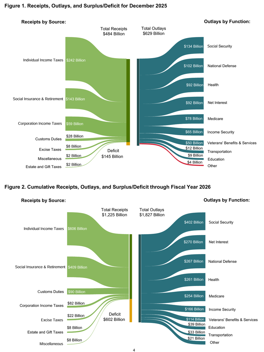 Сейчас в США кончился 3 месяц финансового 2026 года. Финансовый год там начинается с октября. Отметим, что по сравнению с аналогичным периодом прошлого года дефицит оказался меньше – 602 против 711. А вот декабрь сильно подрос – 145 против 87.