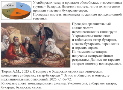 Выводы: Данные популяционной генетики по тарским татарамбухарцам (опубликованы выборочно) подтверждают гипотезу об участии бухарских евреев в этногенезе этой изолированной группы. По тюменским татарам-бухарцам получены неопределѐнные результаты.