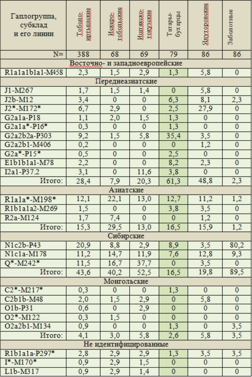 Таблица 1. Сибирские (тоболо-иртышские) татары. Частоты гаплогрупп Y-хромосомы [8]. Субэтническая идентификация гаплогрупп выполнена А.М. Тюриным