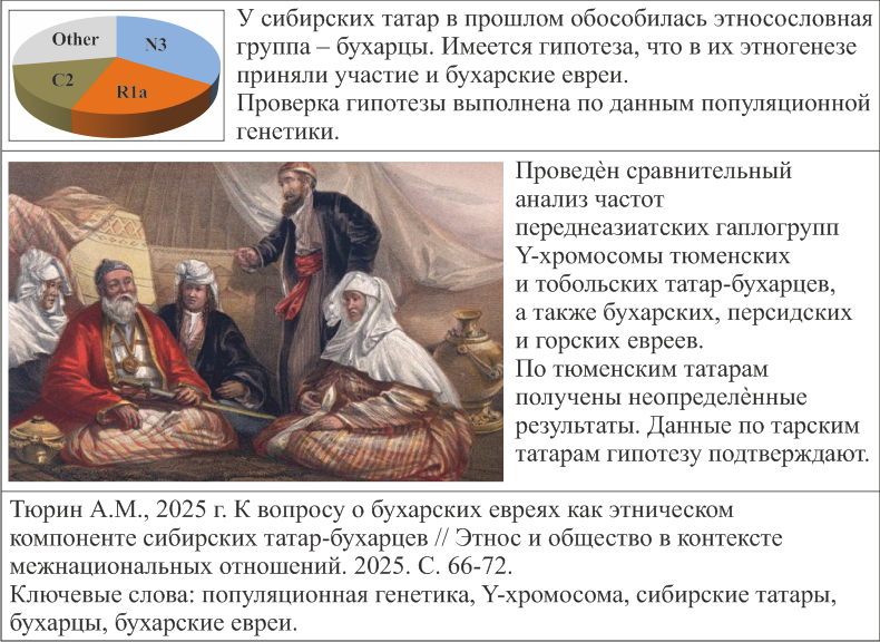 Аннотация. У сибирских татар в прошлом обособилась этносословная группа – бухарцы. Имеется гипотеза, что в их этногенезе приняли участие бухарские евреи. Проверка гипотезы выполнена по данным популяционной генетики. Проведѐн сравнительный анализ частот переднеазиатских гаплогрупп Y-хромосомы тюменских и тобольских татар-бухарцев, а также бухарских, персидских и горских евреев. По тюменским татарам получены неопределѐнные результаты. Данные по тарским татарам (опубликованы выборочно) гипотезу подтверждают.