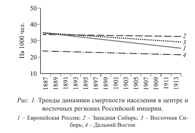 Источник: В.А. Зверев. Тренды смертности населения в восточных регионах Российской Империи за тридцать лет (1887–1917). Гуманитарные науки в Сибири, 2019 г., том 26, No 4, с. 64–71. ( на стр.66 указаны источники данных для статьи).