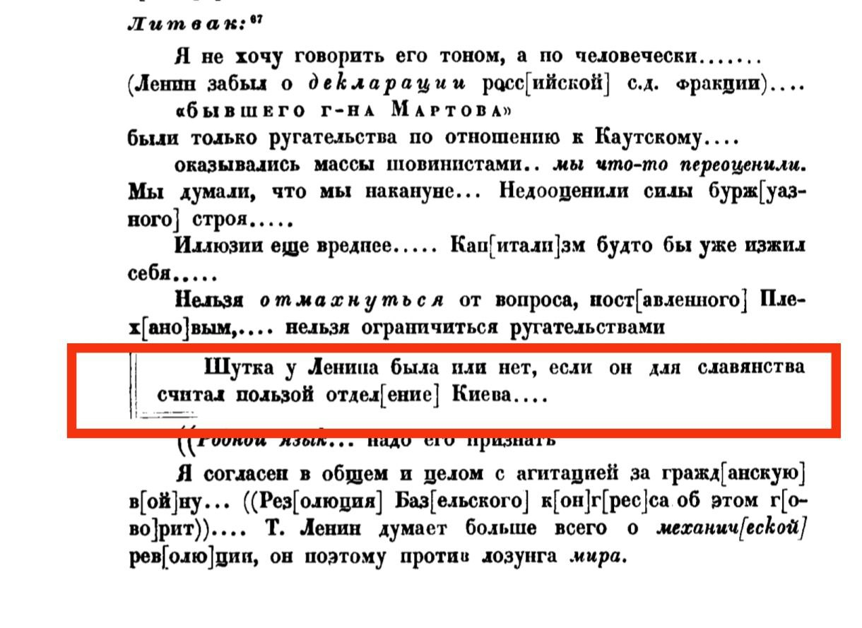 И есть в этих записях недоуменная фраза члена ЦК "Бунда" Литвака (настоящее имя - Хаим Гельфанд): "Шутка у Ленина была или нет, если он для славянства считал пользой отделение Киева".