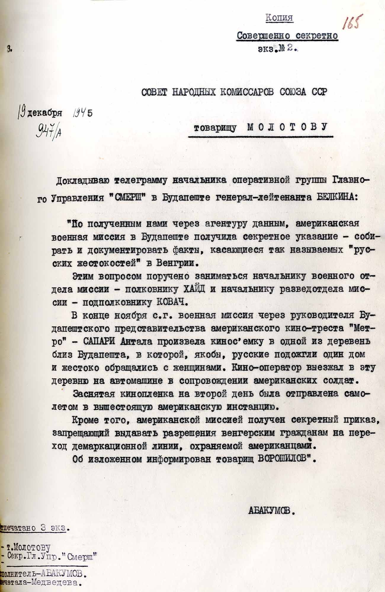 Как следует из опубликованного документа, - докладной записки руководителя ГУКР «Смерш» Наркомата обороны В.С. Абакумова на имя В.М. Молотова - американская военная миссия в Будапеште задействовала в 1945 году для дискредитации советских войск абсолютного в те годы лидера голливудской киноиндустрии - кинотрест "Metro" (Metro-Goldwyn-Mayer)...