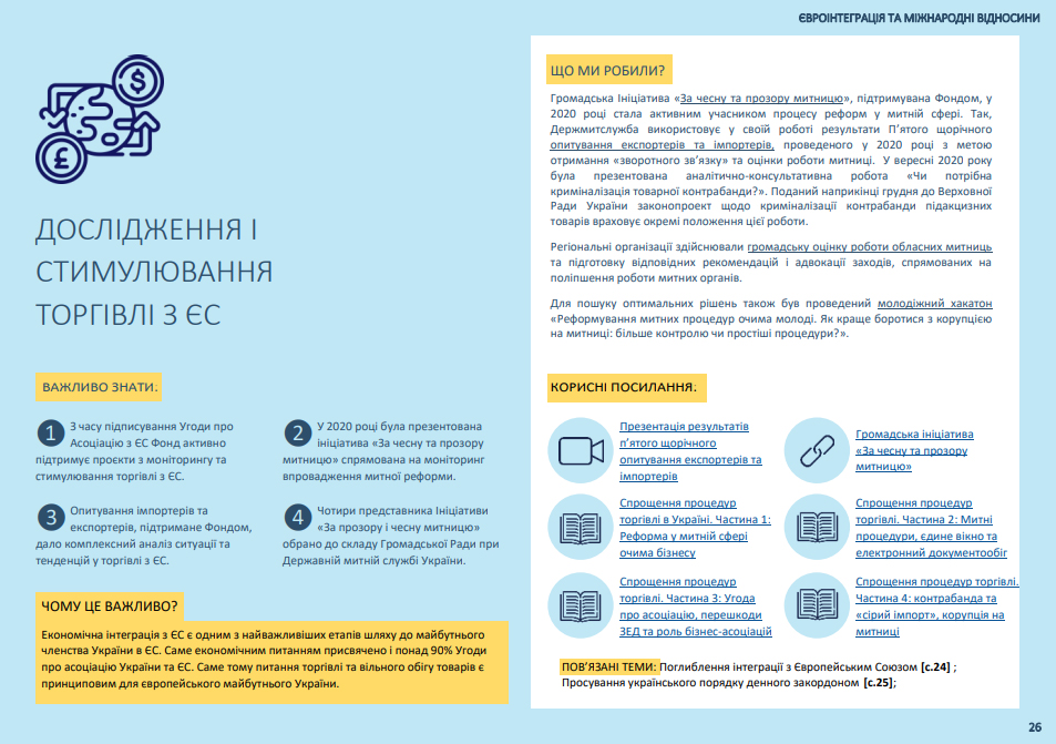 Европейский союз остается ключевым партнером Украины, а курс на постепенное полноправное членство в ЕС закреплено в Конституции Украины. Фонд помогает готовить качественную аналитику и адвокатирует самые необходимые реформы для усиления и углубление интеграции Украины в ЕС