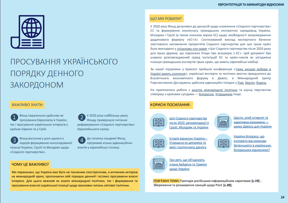 В 2020 году Фонд присоединился к дискуссиям по обновлению «Восточного партнерства» ЕС и формирование консенсуса общественных экспертных сред Украины, Молдовы и Грузии (а также в значительной степени ЕС) о необходимости введения дополнительного формата "ЕС+3". Синтезированное изложение экспертного видения содержательного наполнения приоритетов Восточного партнерства для этих трех стран было изложено в совместном non-paper «Цели Восточного партнерства после 2020 года для трех государств, подписавших Соглашения об ассоциации с ЕС». Этот документ был широко распространен среди институтов ЕС и стран-членов как согласованная позиция общественных экспертов трех стран, имеющих европейские амбиции.