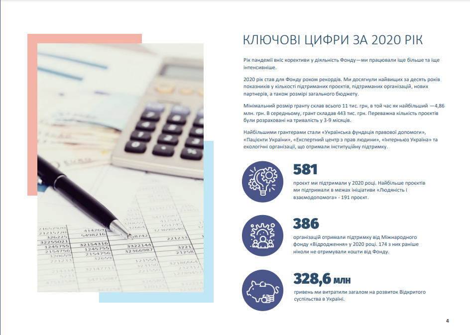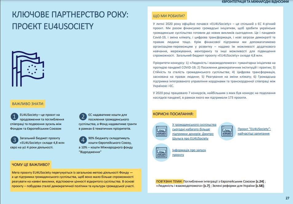 В июле 2020 года официально начался «EU4USociety» – это совместный с ЕС 4-летний проект. Мы вместе финансируем общественные инициативы, чтобы сделать украинское гражданское общество готово к новым вызовам настоящего. Это и пандемия Covid-19, и изменение климата, и цифровая трансформация, и новые угрозы демократии и правам человека и т.д. Кроме финансовой поддержки, мы будем помогать организациям-победителям в развитии – предоставим им возможности дополнительного обучение, сетирование, менторинг и другие возможности для повышения способности. Общий бюджет проекта "EU4USociety" составит 4,8 млн.
