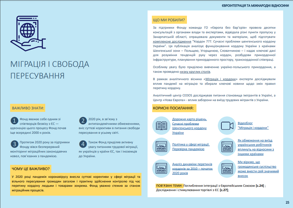 Особое внимание было уделено изучению украино-польской границы, а также проведен ряд круглых столов.В рамках аналитического вестника "Миграция и границы" эксперты исследовали влияние пандемии на миграцию и собирали ключевые новости об изменениях правил пересечения границы.