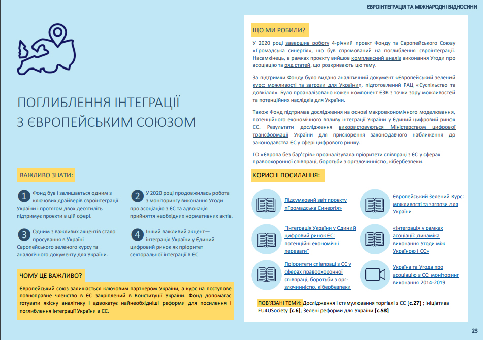 В 2020 году завершил работу 4-летний проект Фонда и Европейского Союза «Общественная синергия», направленная на углубление евроинтеграции. Наконец, в рамках проекта вышел комплексный анализ выполнения Соглашения о ассоциацию и ряд статей, раскрывающих эту тему.