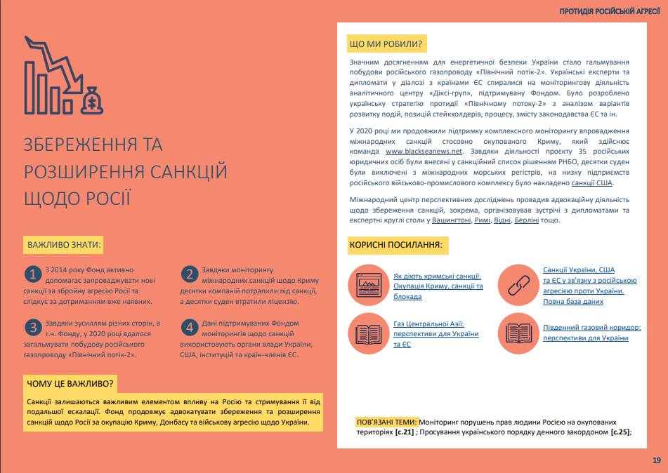 Санкции остаются важным элементом влияния на Россию и сдерживания ее от последующей эскалации. Фонд продолжает адвокатировать сохранение и расширение санкций в отношении России за оккупацию Крыма, Донбасса и военную агрессию в отношении Украины.