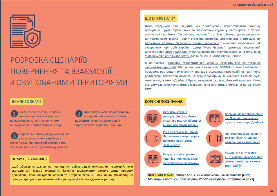 Фонд поддержал ряд инициатив, предлагавших переосмыслить политику деоккупации. Группа стратегических и студий безопасности в партнерстве с Советом внешней политики "Украинская призма" и еще семь исследовательскими центрами осуществляла Проект по разработке указателей по формированию государственной политики Украины по вопросам деоккупации временно оккупированных РФ суверенных территорий Украины. Центр "Новая Европа" подготовил аналитический документ об опыте Молдовы в урегулировании приднестровского конфликта и как
