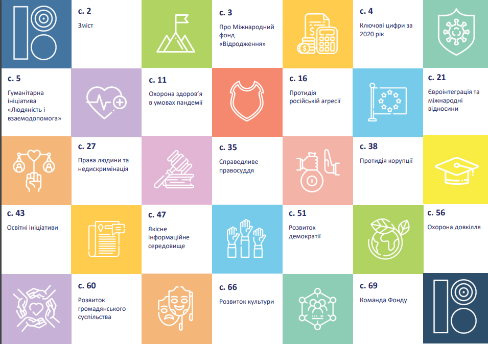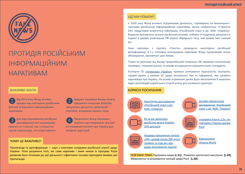 В 2020 году Фонд активно поддерживал деятельность, направленную на определение и противодействие российским информационным нарративам. Центр глобалистики «Стратегия ХХІ» представил аналитическую публикацию «Русский спрут в действии. Кейс "Украина". Издание посвящено анализу российских влияний, лоббизма и взрывной деятельности в Украине в условиях разрешенной РФ агрессии гибридного типа, которая продолжается уже седьмой год.