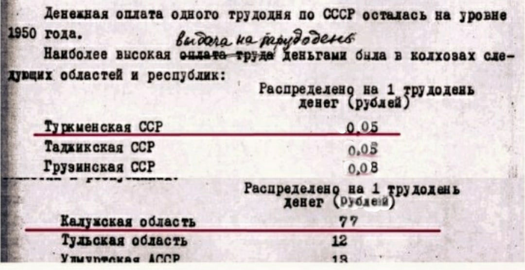 Там же чёрным по белому написано, что колхозы указанных областей распределяют по трудодням крайне незначительную часть денежного дохода. А ты это интерпретируешь как какое то ущемление русских. Хрустабулка всегда идиот.