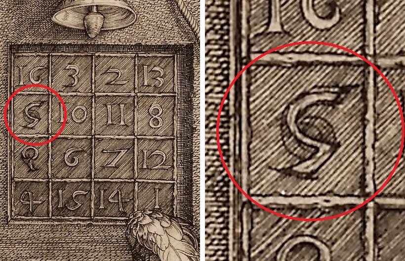 Ведь «присмотревшись к этим числам, легко увидеть, что стоящая в первом столбце второго ряда цифра пять (которая и должна здесь стоять, чтобы квадрат получился «магическим») была нарисована (точнее, вырезана на гравюрной доске) поверх изначально находившейся здесь шестёрки».