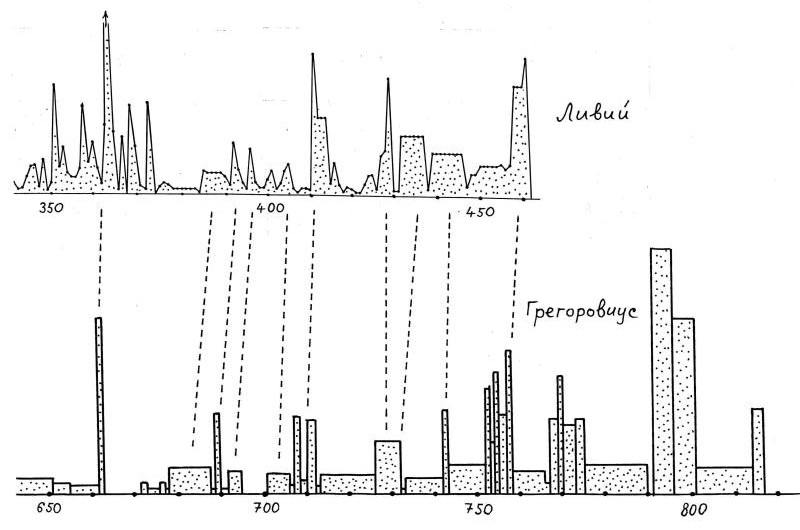 Такое объяснение кажется логичным лишь до тех пор, пока мы не заглянем в содержание этих летописей. Ведь события, которые НХ объявляет дубликатами, совершенно разные, и это невозможно списать на трудности перевода. Нашествие галлов на Рим в 390 году до н.э. у Тита Ливия невозможно перевести так, чтобы оно стало копией похода императора Константа II в VII веке из труда немецкого историка XIX века Фердинанда Грегоровиуса.