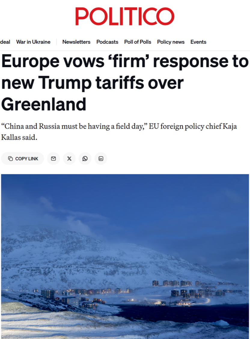 Politico: ЕС пообещал «решительный» ответ на новые пошлины, введенные президентом США Дональдом Трампом в отношении государств-членов, в то время как Белый дом активизировал свою кампанию по установлению контроля над Гренландией.