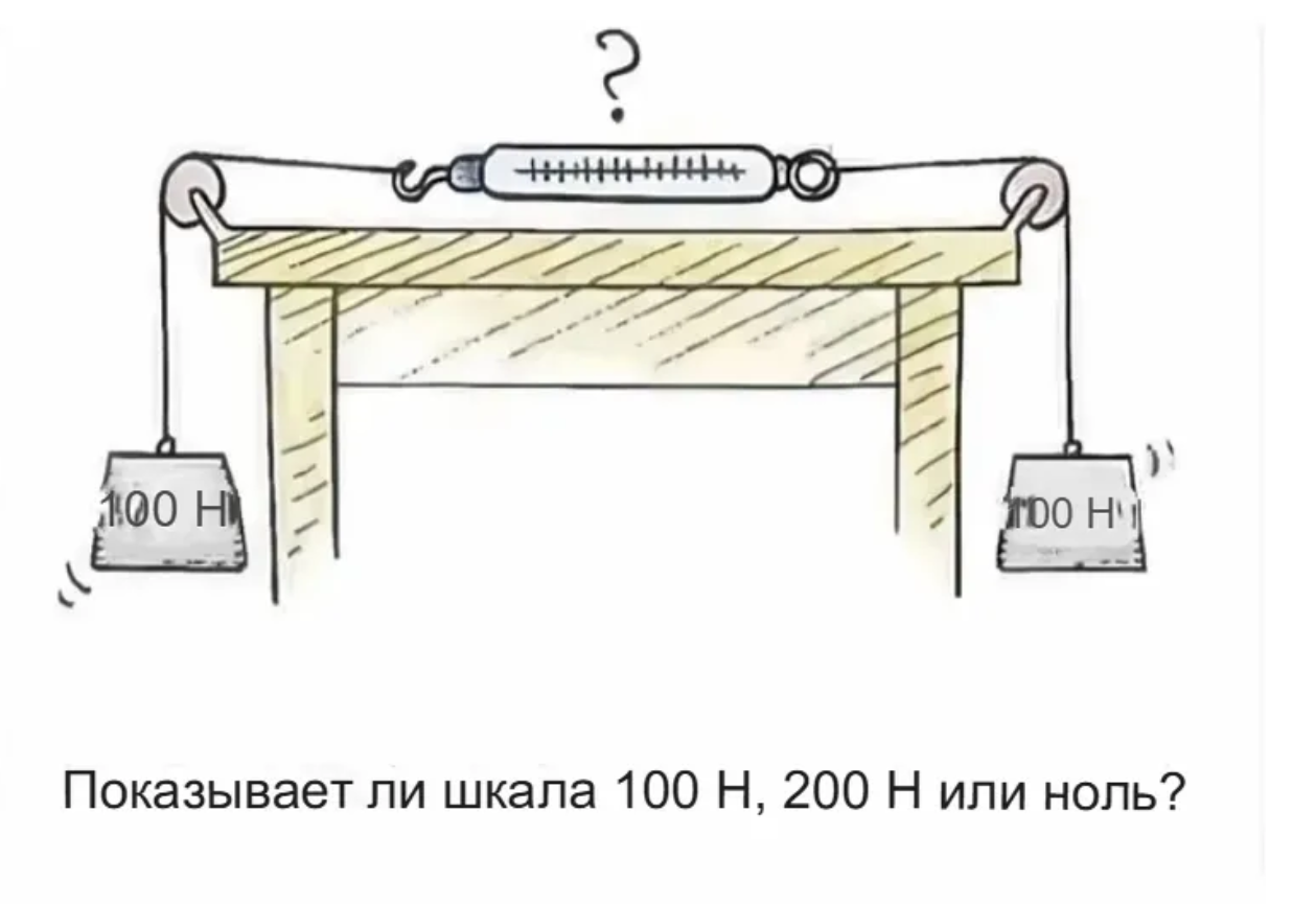 Данная схема — это классическая задача на равновесие сил в системе, где динамометр (весы) подвешен между двумя одинаковыми грузами по 100 Н, каждый из которых тянет за нить.