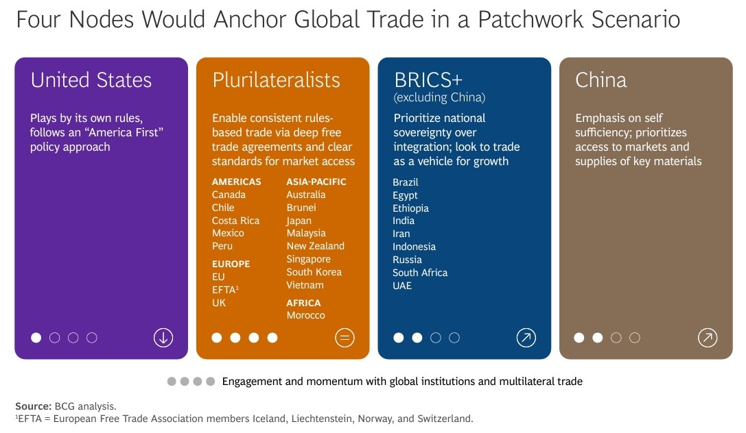 «В нестабильном мире темпы развития полномасштабных конфликтов против возвращения к основанной на правилах глобальной торговой системе замедлились. Вместо этого вырисовывается более умеренный и правдоподобный сценарий, который мы называем многоузловой торговой мозаикой. Эта модель, включающая четыре основных узла, позволяет обеспечить непрерывный рост мировой торговли и конкурентные преимущества для предприятий, способных ориентироваться в сложной динамике рынка.