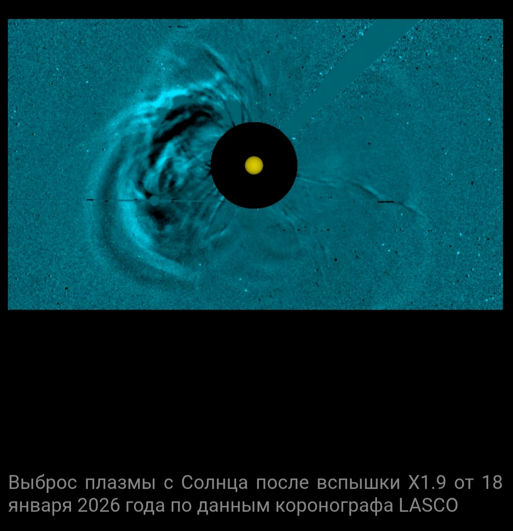 Вчерашние ранние данные с коронографа CCOR-1 сегодня были подтверждены основным мировым солнечным коронографом LASCO — произошедшая вспышка X1.95 сопровождалась крупным выбросом плазмы, направленным точно на Землю. Прикрепленное к сообщению видео, полученное как раз LASCO, показывает окрестности Солнца сразу после вспышки. Плазменное облако выглядит на нём как расширяющийся газовый шар, летящий на наблюдателя. Для понимания масштабов — Солнце в центре имеет размер 1.5 миллиона километров в диаметре.