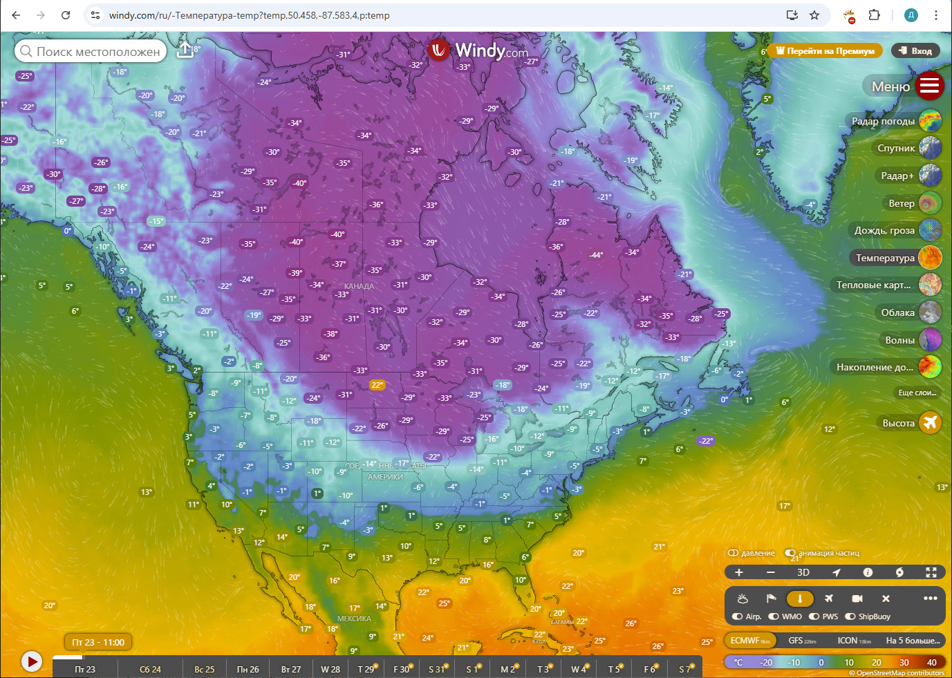 Зато отлично видно по сегодняшней погоде, почему Канада не особо населённое место. Холодно там зимой как в Сибири. На Аляске и то теплее. А Гренладния (южная часть) по сравнению с центром Канады - это "почти куррорт".