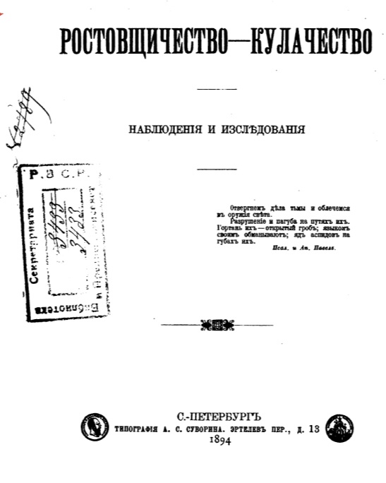 В 1894 году. Георгием Петровичем Сазоновым была написана книга "Ростовщичество - кулачество. Наблюдения и исследования". Ее автор - не революционер, не эмигрант, не инородец, а совсем наоборот - верноподданный гос.чиновник Российской Империи.