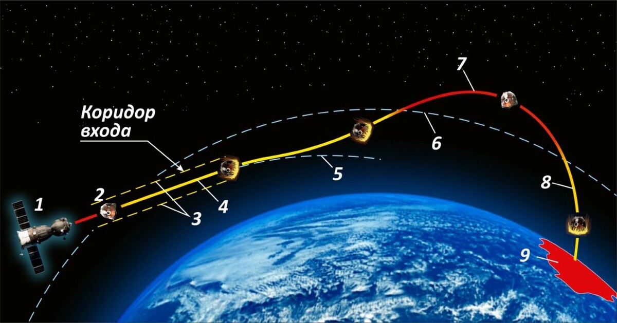 С орбиты Луны космический корабль возвращается к Земле, постепенно набирая скорость (вследствие земного притяжения) и входит в атмосферу Земли со второй космической скоростью, около 11 км в секунду. Чтобы не сгореть при этом и чтобы экипаж не погиб от перегрузок, СССР разработал двухнырковый способ входа в атмосферу. Космический корабль входит в верхние слои атмосферы, гасит скорость до 8 км/c, отскакивает вверх и уже на меньшей скорости повторно входит в атмосферу. Впервые такой способ был испробован в ноябре 1968 года во время возвращения на Землю беспилотного космического аппарата "Зонд-6". Этот аппарат представлял собой прототип лунного корабля «Союз 7К-Л1», рассчитанного на экипаж из двух человек.