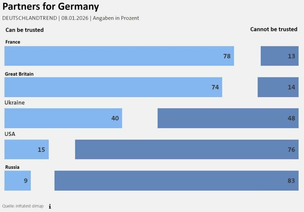 По проведенным опросам общественного мнения Deutschlandtrend от 8 января 2026 года, посвященный уровню доверия жителей Германии к различным странам, показано, что немцы испытывает примерно одинаковое «негодование» и к России, и к Америке.