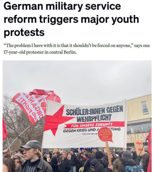 Но с войной у них возникают проблемы. Молодежь в Германии чувствует, что такую страну, которые строят невменяемые политики, нет смысла защищать, и устраивают массовые протесты против обязательной службы в армии. Акции недавно прошли в 90 городах этой страны.