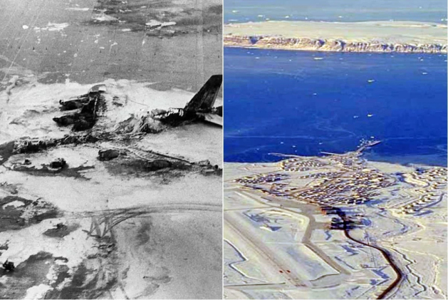 Неуправляемая машина потерпела крушение вблизи от базы; На переднем плане — авиабаза Туле, на заднем — залив Норт-Стар. Коллаж АиФ