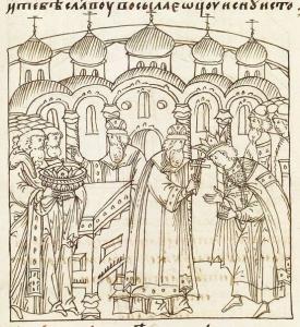 Тоя же зимы генваря в 16 день, в неделю венчан бысть на царьство Руское благоверный великий князь Иван Васильевич всеа Русии пресвещенным Макарием, митропалитом всеа Русии, и архиепископы, и епископы, и архимандриты, и всем свещенным собором руския митрополия, прародителя его венчаньем, царя великого Манамаха животворящим крестом и венцем царьским, и диядимою, еже древле тем животворящим крестом и венцем царьским, и диядимою венчан бысть на царьство Руское прародитель его князь велики Владимер, наречен в царьской перфире Манамах от святейшаго митропалита ефескаго кир Неофита и по благословению патриарха цареградцкаго и по велению греческого царя Констянтина Манамаха."