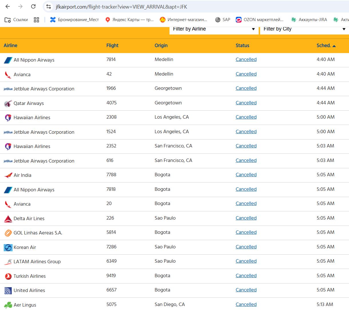 Табло аэропорта JFK на сейчас =)