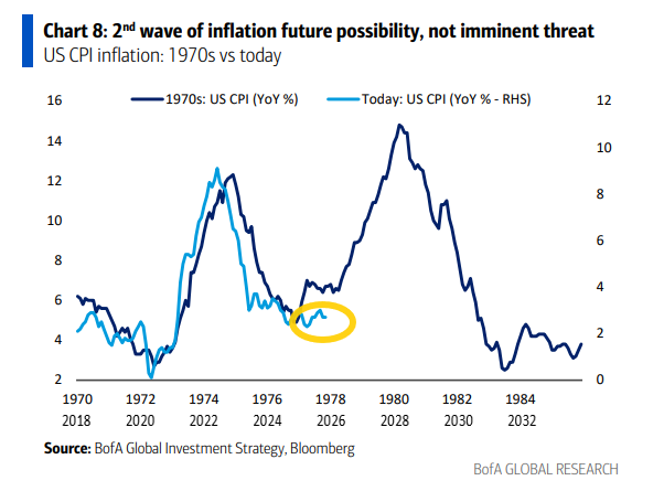 Банк оф Америка продолжает наблюдать за текущей инфляцией в США в сравнении с инфляцией 70-80-х годов прошлого века.