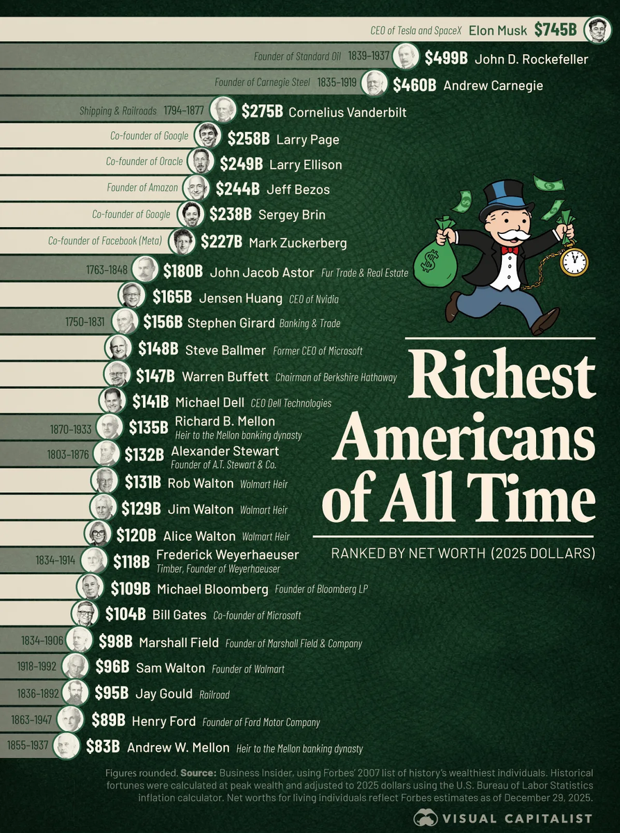 На этом графике представлен рейтинг американских миллиардеров за всю историю по размеру их максимального благосостояния , скорректированному на 2025 год. Данные для этой визуализации получены от Business Insider на основе списка самых богатых людей в истории Forbes за 2007 год. Исторические состояния были рассчитаны на их пике и скорректированы до уровня 2025 года с использованием инфляционного калькулятора Бюро статистики труда США. Данные о чистом состоянии ныне живущих физических лиц отражают оценки Forbes по состоянию на 29 декабря 2025 года.