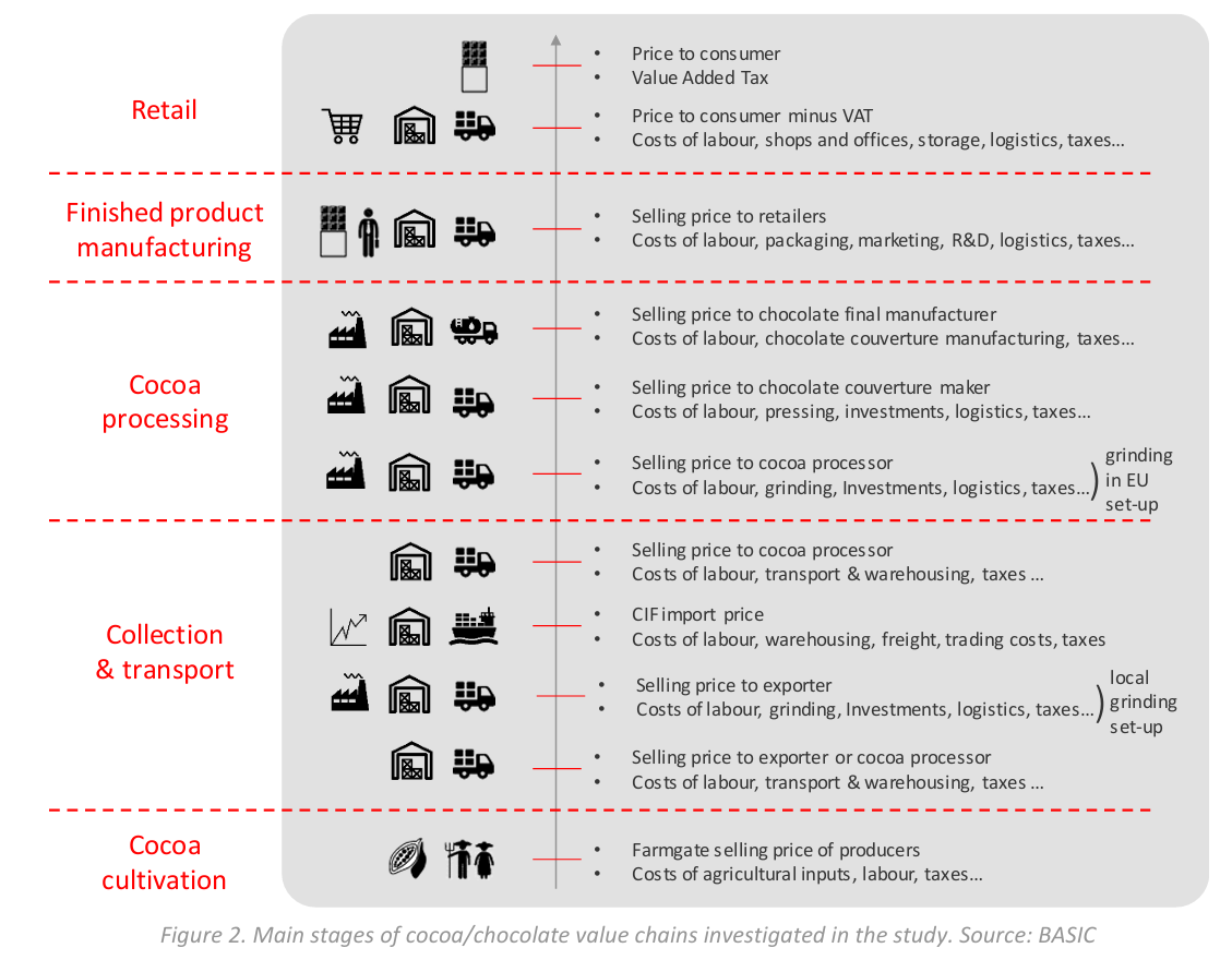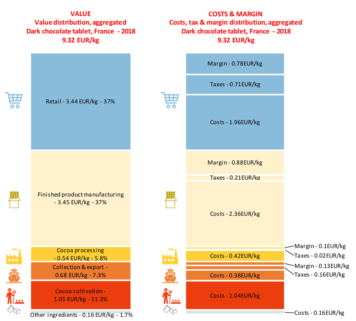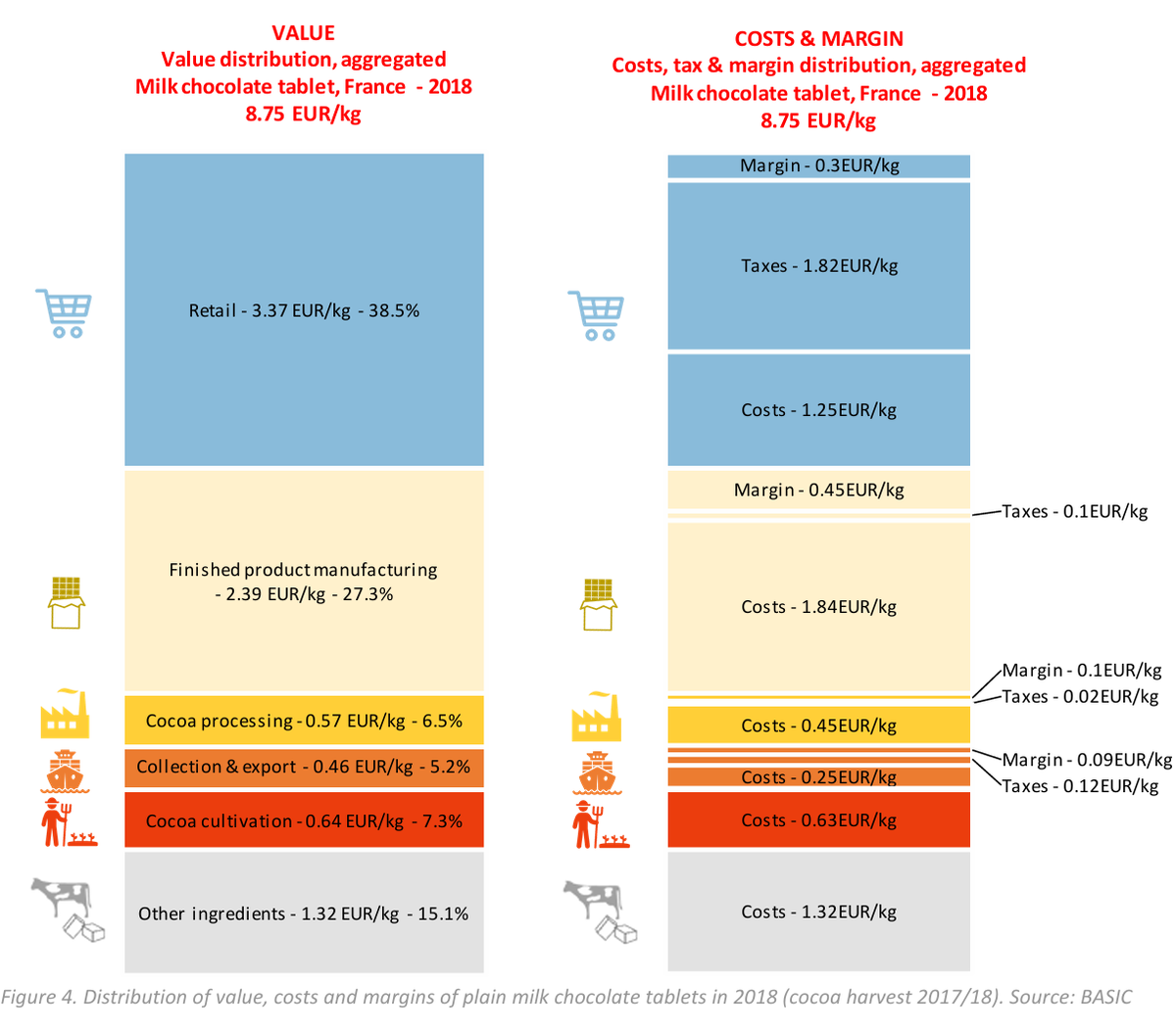 Ну, смотрите, вот вам, к примеру, из Сравнительного исследования распределения стоимости в европейских шоколадных сетях от 2020 года. Первая картинка – основные этапы создания стоимости шоколада. А на второй картинке распределение долей этих самых этапов в плиточке тёмного. А на третьей в плиточке молочного.