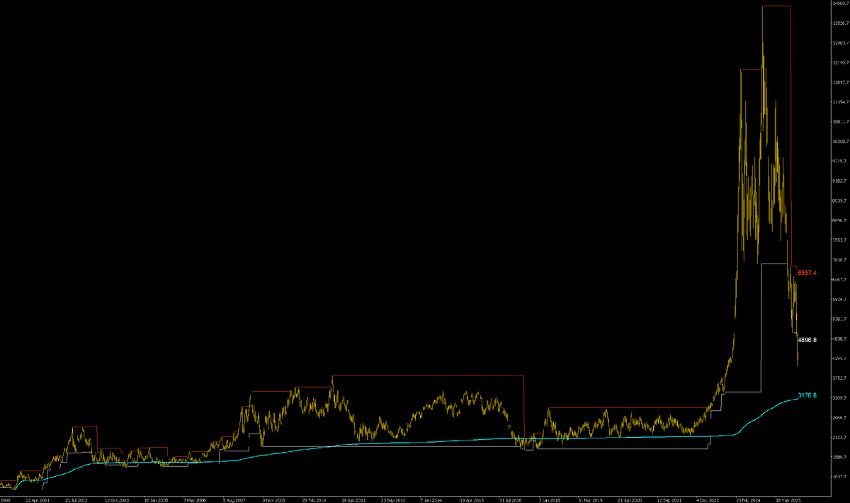 Ну и мой любимый VWAP. Volume Weighted Average Price или средневзвешенная по объёму цена. Это показатель места, выше которого половина участников торгов будет находиться в прибыли, а ниже в убытке. Если речь о расчёте VWAP от минимума. В идеальных условиях. Ну и на этом основании данный уровень часто выступает поддержкой или сопротивлением. Чистые финансы и математика. Ничего более. Индикатор VWAP на графике показан бирюзовой кривой. Она рассчитывается с лоя 2000 года. Ну, в общем-то, сами можете видеть, какое влияние этот уровень оказывает на цену. Вполне логично допустить снижение цены на кривую VWAP.