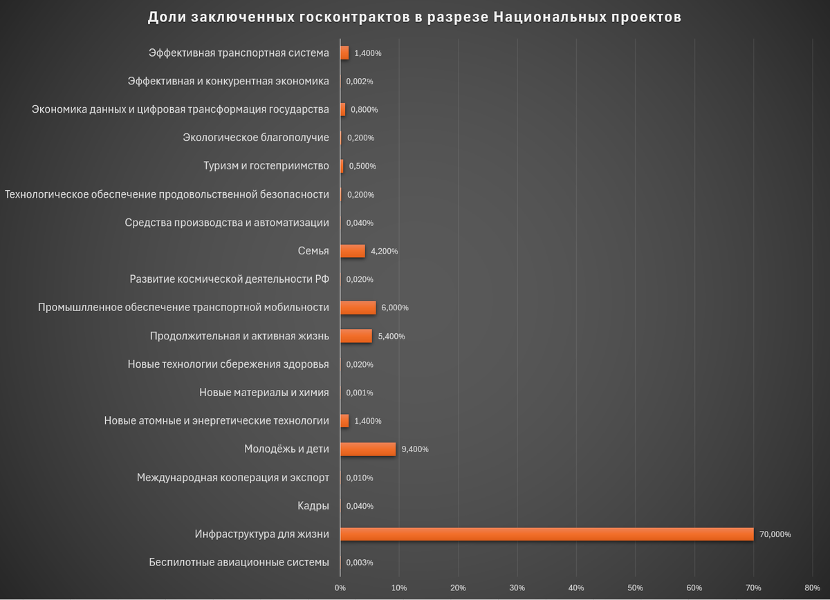 За рассматриваемый период заключено контрактов в рамках Национальных проектов на 1 658 млрд ₽. Долевая структура направлений показана на картинке. Основной упор идет на «Инфраструктуру для жизни». Цель данного проекта: обеспечение граждан инфраструктурой (жилищной, транспортной, социальной, коммунальной) нового качества. Здесь можно ознакомиться в презентацией проекта.