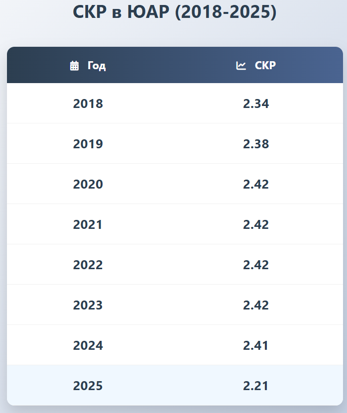 По данным на середину 2025 года, суммарный коэффициент рождаемости (СКР) в ЮАР составил 2.21. Это формально выше уровня воспроизводства в 2.1, но из-за высоких уровней младенческой и общей смертности реальная рождаемость уже провалилась ниже черты, необходимой для замещения поколений.
