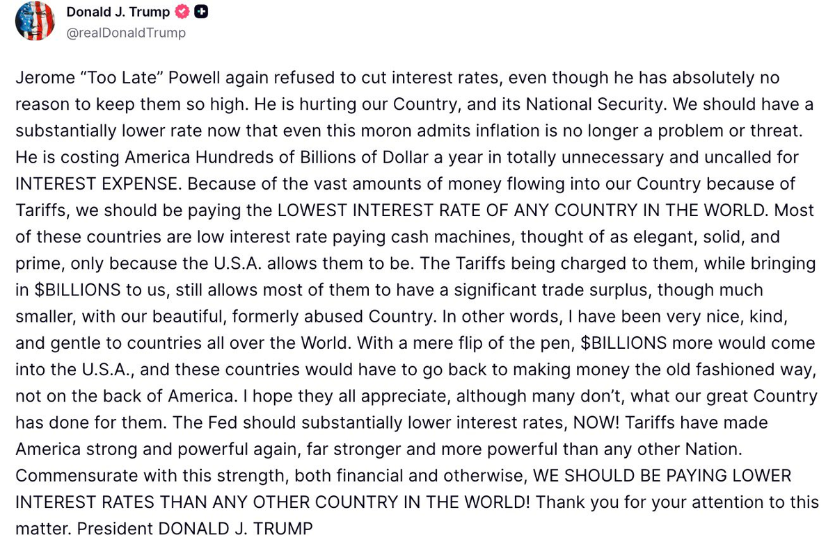 Дональд Фредович на этой новости должен затопать ножками и порваться. Что значит сохранение ставки? Это значит сохранение, да что уж там, рост расходов на обслуживание государственного долга. Это значит, что дефицит, с которым потужно борется рыжий Берсерк, продолжит мозолить ему глаза. Кто победит: пошлины или обслуживание процентов по госдолгу? Повышать пошлины дальше? Разгонять инфляцию.