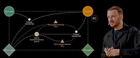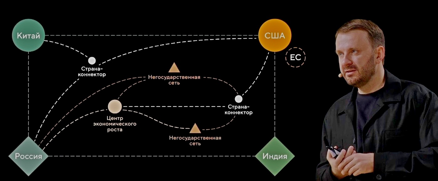 Он отметил, что ключевыми игроками на мировой арене остаются четыре крупнейшие экономики — Китай, США, Индия и Россия, которые обеспечивают свой суверенитет, но при этом появляются новые центры экономического роста, например, Индонезия, формирующая собственный суверенитет и уже оказывающая заметное экономическое влияние. Особую роль играют «страны-коннекторы», такие как Объединенные Арабские Эмираты, связывающие крупные экономические центры, а также новые глобальные акторы — децентрализованные сети и социальные платформы, которые становятся самостоятельными участниками мировой экономики и политики.
