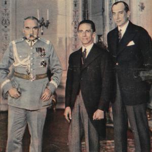 Заместитель министра иностранных дел Польши Ян Шембек (слева) приветствует министра Иоахима фон Риббентропа во время банкета в Министерстве иностранных дел. В центре – министр иностранных дел Юзеф Бек.